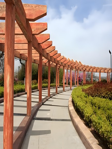 木制長(zhǎng)廊具有自然、溫馨的質(zhì)感,能夠很好地融入自然環(huán)境,提升景觀的整體美感。木材的紋理和質(zhì)感也能增添歷史和文化底蘊(yùn)。