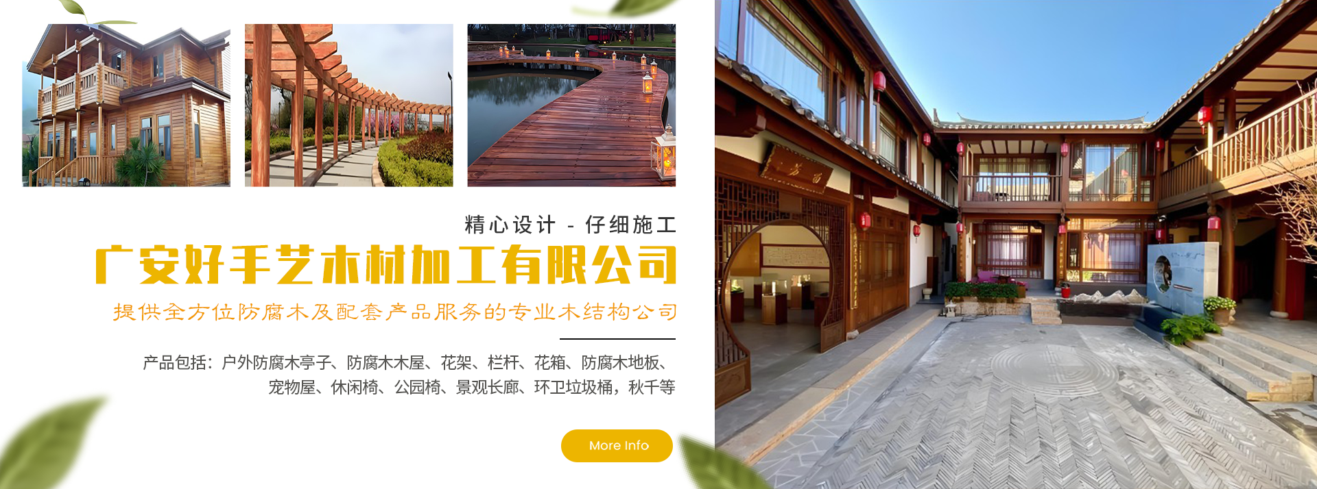 廣安好手藝木材加工有限公司專業(yè)從事防腐木木材的生產(chǎn)及銷售,企業(yè)立足防腐木材生產(chǎn)、銷售、設(shè)計(jì)、咨詢?yōu)橐惑w的綜合性企業(yè),產(chǎn)品包括:戶外防腐木亭子、防腐木木屋、花架、欄桿、花箱、防腐木地板、寵物屋、休閑椅、公園椅、景觀長(zhǎng)廊、環(huán)衛(wèi)垃圾桶,秋千等公共配套設(shè)施的生產(chǎn)、銷售、安裝。